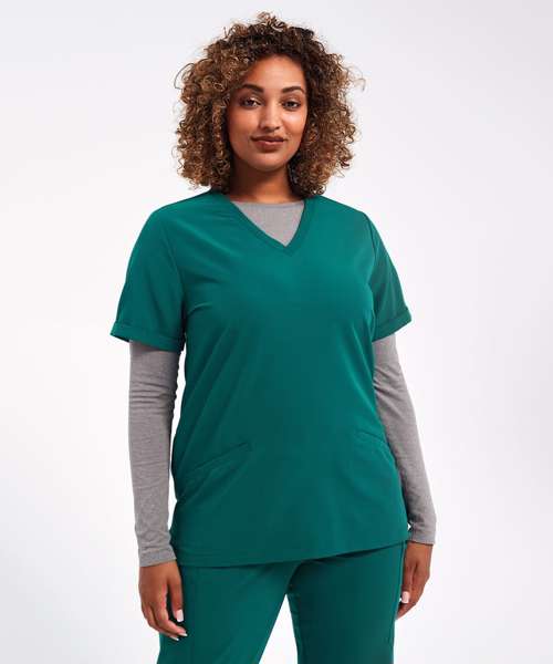 Women’s short sleeve scrub tunic. Comfortable four-way stretch. Breathable, easycare, crease-resistant fabric. V-neck, turn-up sleeves and two front pockets. Back darts, side vents and modern fit. Decorate with embroidery and/or print. Contains certified recycled polyester.