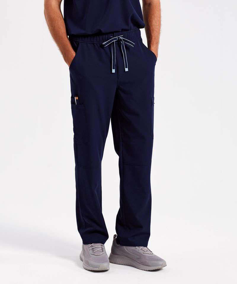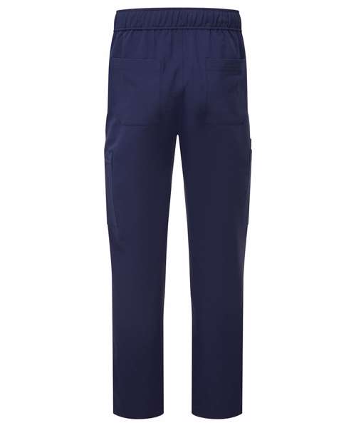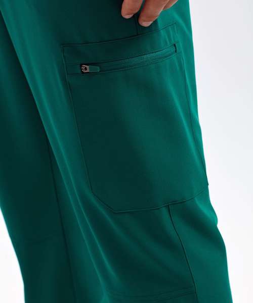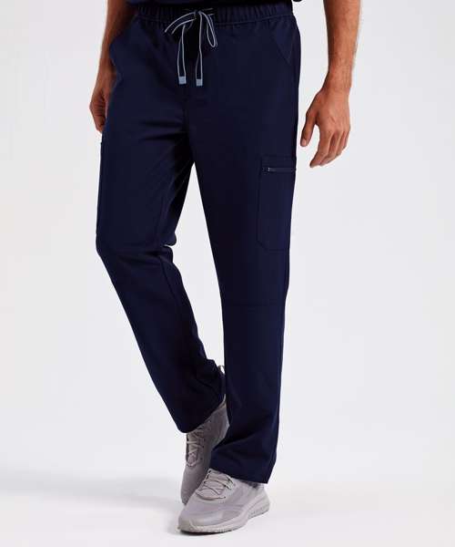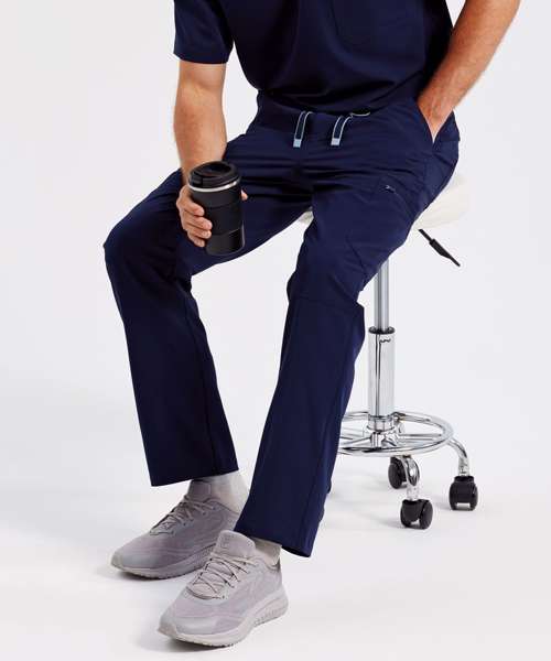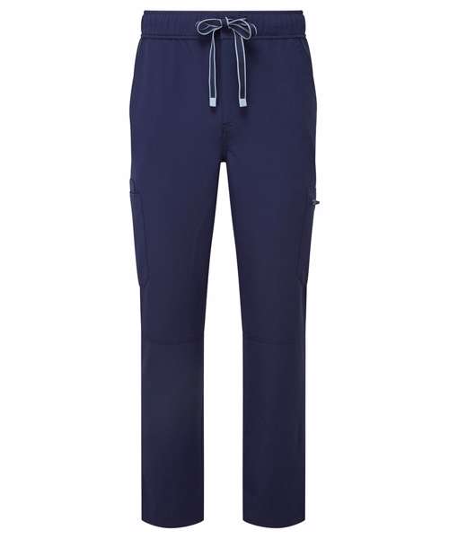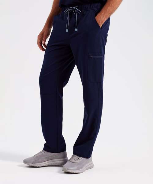 Men’s cargo scrub pants. Comfortable four-way stretch. Breathable, easycare, crease-resistant fabric. Single-button waistband with adjustable drawcord and zip fly. Multiple mobile-friendly coin and zip pockets. Hemmed side vents. Decorate with embroidery and/or print. Contains certified recycled polyester.