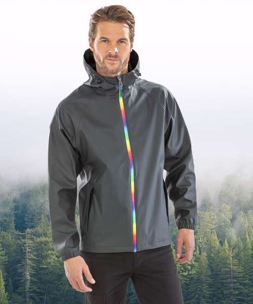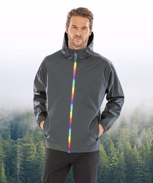 Waterproof 3,000mm. Breathable 1,000mvp. Windproof. Vibrant, coloured zip-through collar with chin guard and zip pull. Waterproof welded seams. Soft and supple-feel fabric. Integral drawcord hood. Longer back length. Underarm eyelets. Elasticated cuff. Zipped pockets. Hang loop. Recycled backing fabric.
