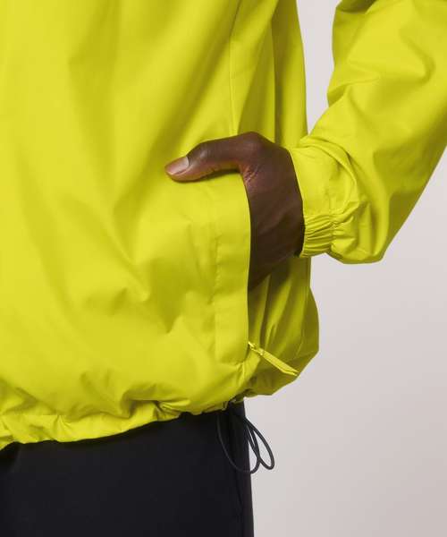 Longer back length with curved hem for protection. Bottom hem and hood with adjustable plastic stopper and elastic cord. Sealed hood visor and sealed welt pockets. Zipped welt pockets with extra grosgrain pull. Self-fabric half-moon at back neck. Inside zip opening at bottom hem and wearer’s left chest for easy decoration.