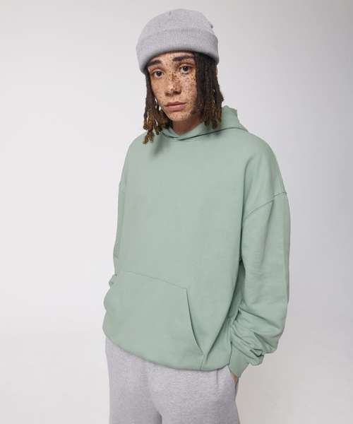 Unisex boxy dry hand-feel hoodie sweatshirt. Set-in sleeve. Double-layered hood in self-fabric. Inside single Jersey back neck tape. Self-fabric half-moon at back neck. Single needle topstitch at neckline and along hood opening. 2x1 rib at sleeve hem and bottom hem. Armhole, sleeve hem and bottom hem with twin-needle topstitch. Kangaroo pocket at front.