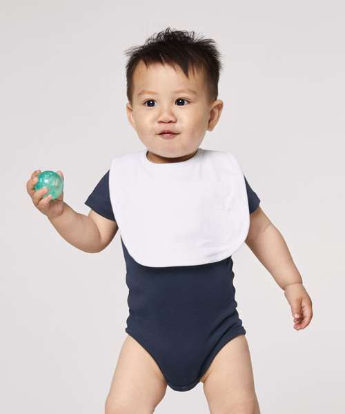 Baby bib. Double-layer interlock. Self-fabric rouleau binding at neck and outside edge. Double snap-closure size adjustment at back neck.