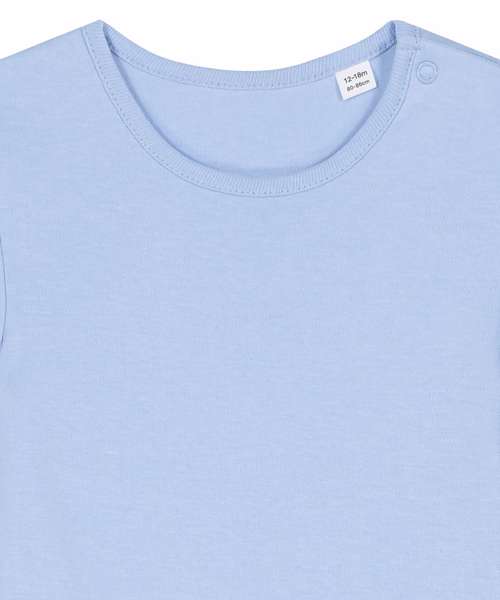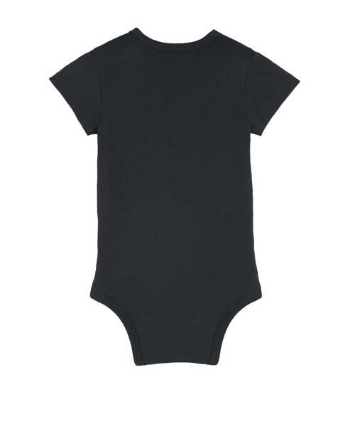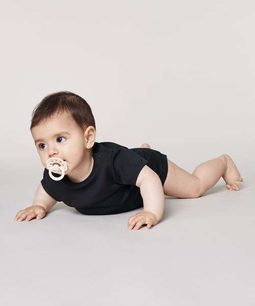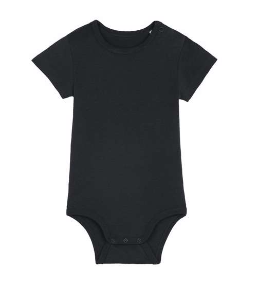 Short sleeve baby bodysuit. Set-in sleeve. 1x1 rib binding at neck collar and leg opening. Snap placket at shoulder. Snap closure at bottom.