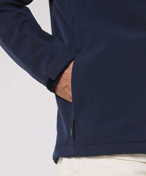 Men’s softshell jacket, medium fit with a high collar and set-in sleeve. Bottom hem with adjustable plastic stopper and elastic cord. Reverse nylon zip at centre front. Zipped outside welt pockets with reflective elastic puller. Fully bonded inside fleece layer. Side panels and stretch for better shape. Adjustable hook and loop sleeve opening. Inside seams finished with recycled binding. Water-repellent up to 10,000mm, breathability up to 3000G/M2/24hrs allowing perspiration to escape. Windproof. Bionic ECO DWR (durable, water-repellent) finish.