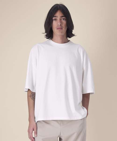 Unisex recycled cotton boxy t-shirt. Set-in sleeves. Forwarded shoulder seam. 1x1 rib at neck collar. Self-fabric back neck tape. Twin-needle topstitching at sleeve cuffs and hem.Contains 50% GRS-certified recycled cotton and 50% OCS-certified organic cotton, certified by Control Union CB-CUC-1393082.