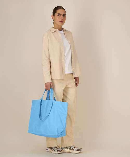 Woven shopping bag. Folded hem at top edge. Hidden snap closure. Bottom and side soufflé. Long and short self-fabric handles with cross-stitch for reinforcement. Inside self-fabric pocket. Herringbone tape on inside seams for a clean finish. Single-needle stitch at top edge.