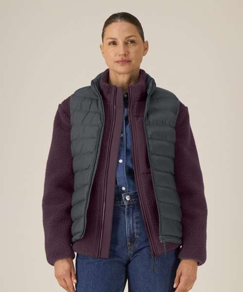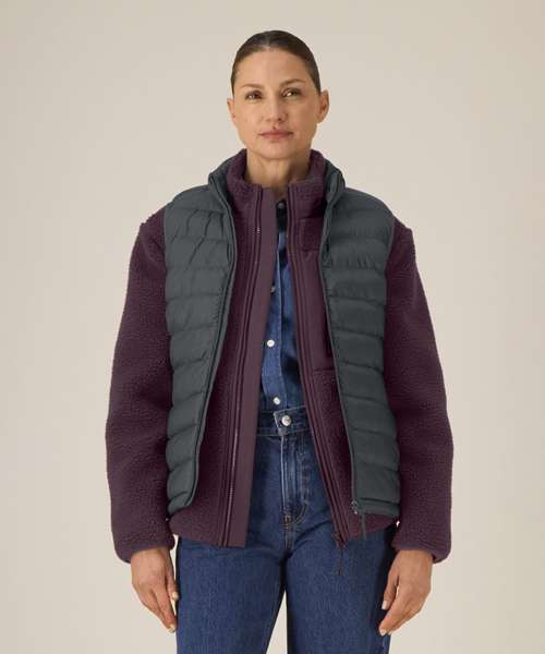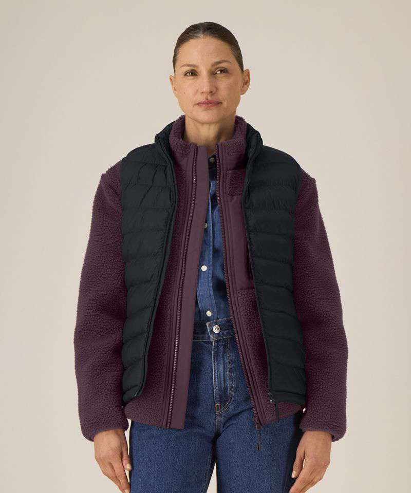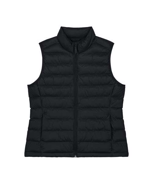 Women’s bodywarmer. Fitted. Sleeveless. High collar. Reverse nylon zip at centre front. Zipped welt pockets with extra grosgrain puller. Elastic tape binding at the armhole. Fully quilted. Side panels for a better shape. Inside seams with binding finish. Bottom hem has an adjustable plastic stopper and elastic cord.