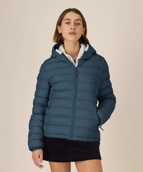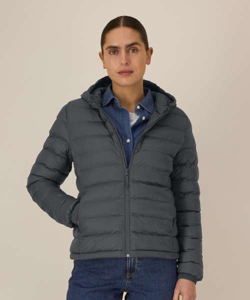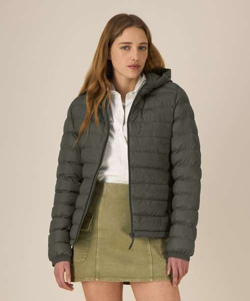 Women’s padded jacket. Fitted. Set-in sleeve. High collar with grown-on hood. Hood opening and bottom hem have an adjustable plastic stopper and elastic cord. Reverse nylon zip at centre front. Zipped welt pockets with extra grosgrain puller. Fully quilted. Side panels for a better shape. Self-fabric elasticated cuff. Inside seams with binding finish. Bottom hem has an adjustable plastic stopper and elastic cord.