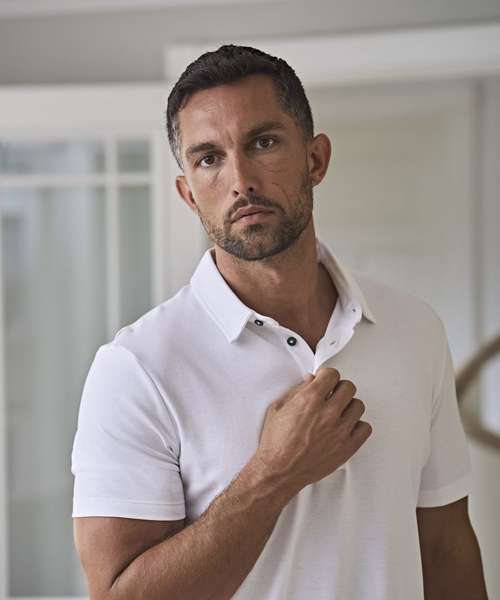 A stylish, state-of-the-art interlock polo shirt in 44 singles 100% Pima cotton, featuring a slim-fitted body. It has a self-fabric, stand-up collar, finished with an elegant placket with anthracite pearl imitation buttons.