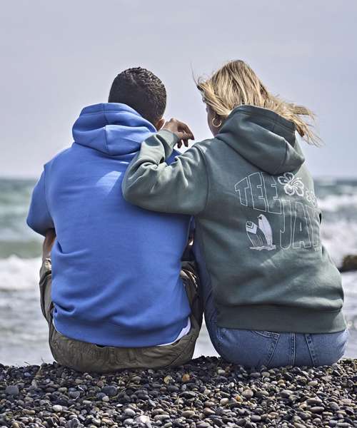 Three-thread fabric. Brushed inside. Ribs with elastane. Double dyed. Double stitched. Double pre-shrunk. Washable at 60˚C.