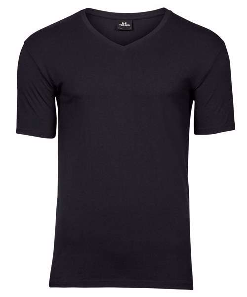 The slim-fitted Stretch v-neck tee features a two-layer slim neck rib and reinforced shoulders.