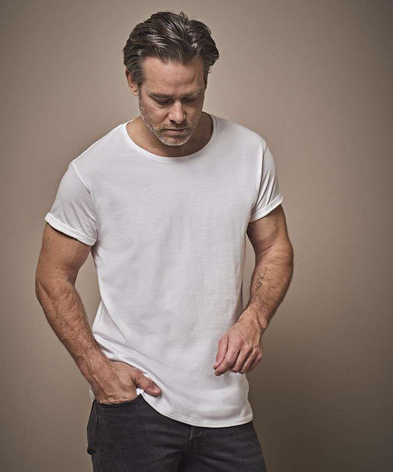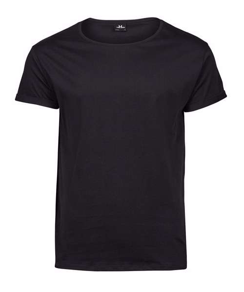 The fashion-fit, single Jersey, Roll-up tee is made from premium quality, long-fibre cotton. It features roll-up sleeves with bar tacks and a large neck opening with a minimalistic neck rib.