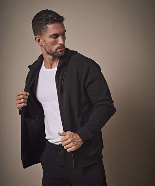 Elevate your style with the signature Ribbed interlock hooded full-zip – the pinnacle of comfort and modern fashion. It features a soft hood with a string, plus two open front pockets. Crafted with innovative rib interlock fabric and stylish details, it’s a unique addition to your wardrobe.
