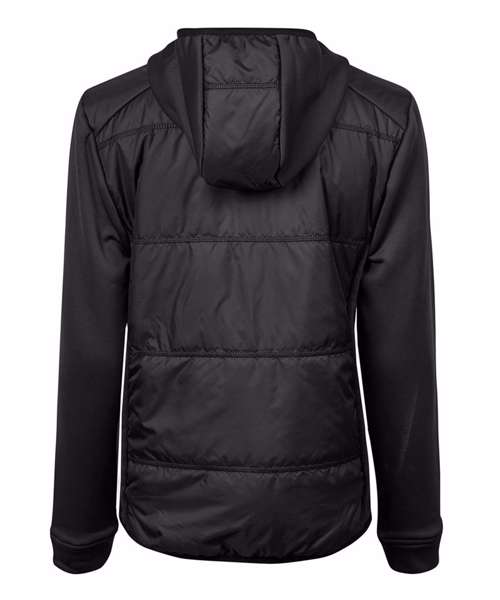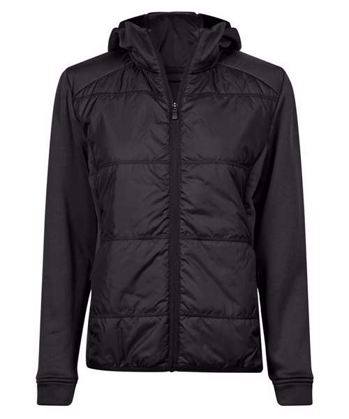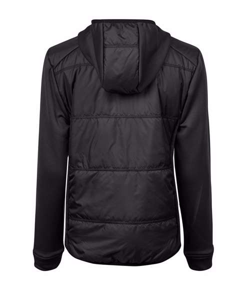 The Women’s hybrid-stretch hooded jacket is made from 300T polyester fabric combined with stretch fleece panels and sleeves. It’s insulated with premium DuPont™ padding on the body, with cuffs and elastic banding at the bottom hem for a modern look. It features quality SBS zips, an inner pocket and two large hidden front pockets. The hood makes this jacket extra-comfortable on colder days.